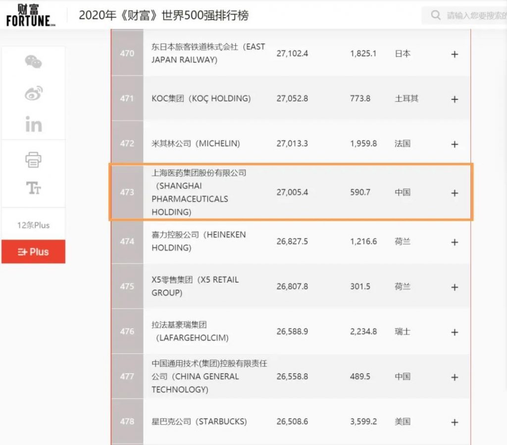 2020年8月10日,《財富》雜志正式發(fā)布“2020年《財富》世界500強排行榜單”,上海醫(yī)藥集團股份有限公司(601607.SH,02607.HK,以下簡稱“上海醫(yī)藥”)首次進入榜單,位列第473位,中國企業(yè)排名第124位。榜單顯示,全球共有21家醫(yī)藥企業(yè)上榜,上海醫(yī)藥是其中僅有的兩家中國藥企之一。